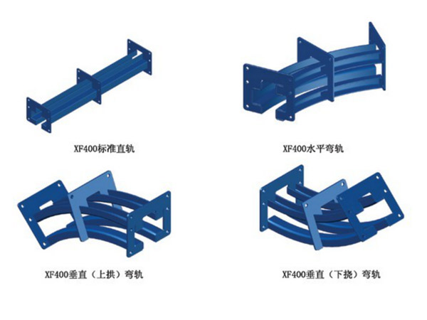XF400型輸送機(jī)軌道包括標(biāo)準(zhǔn)直軌、水平彎軌、垂直彎軌、檢查軌、熱伸縮軌等。軌道由優(yōu)質(zhì)鋼板壓制成型,標(biāo)準(zhǔn)軌道長(zhǎng)度6000,軌道兩邊裝有安裝括架,軌道中間每600裝有定位括架,軌道連接可以用螺栓連接,也可以將兩端的括架焊接連接。